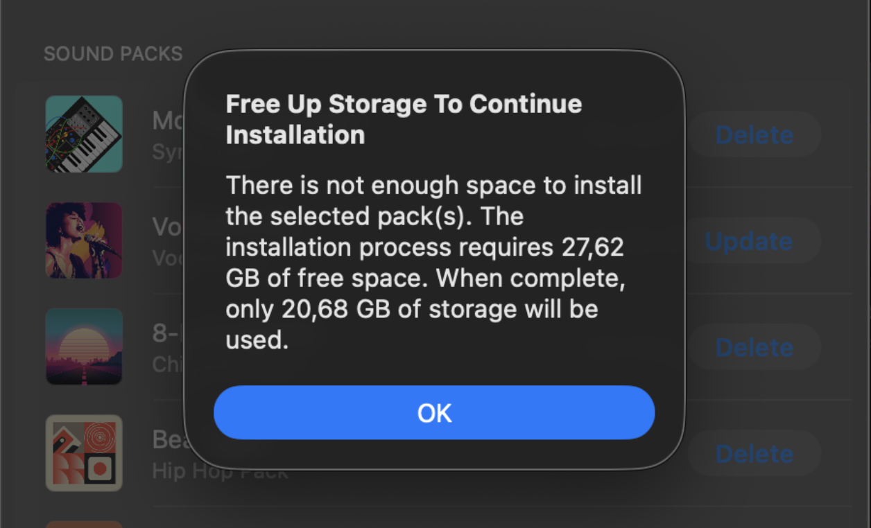 Даже если ваша библиотека лежит на внешнем диске, Logic Pro 12 использует архитектуру инсталлятора macOS: